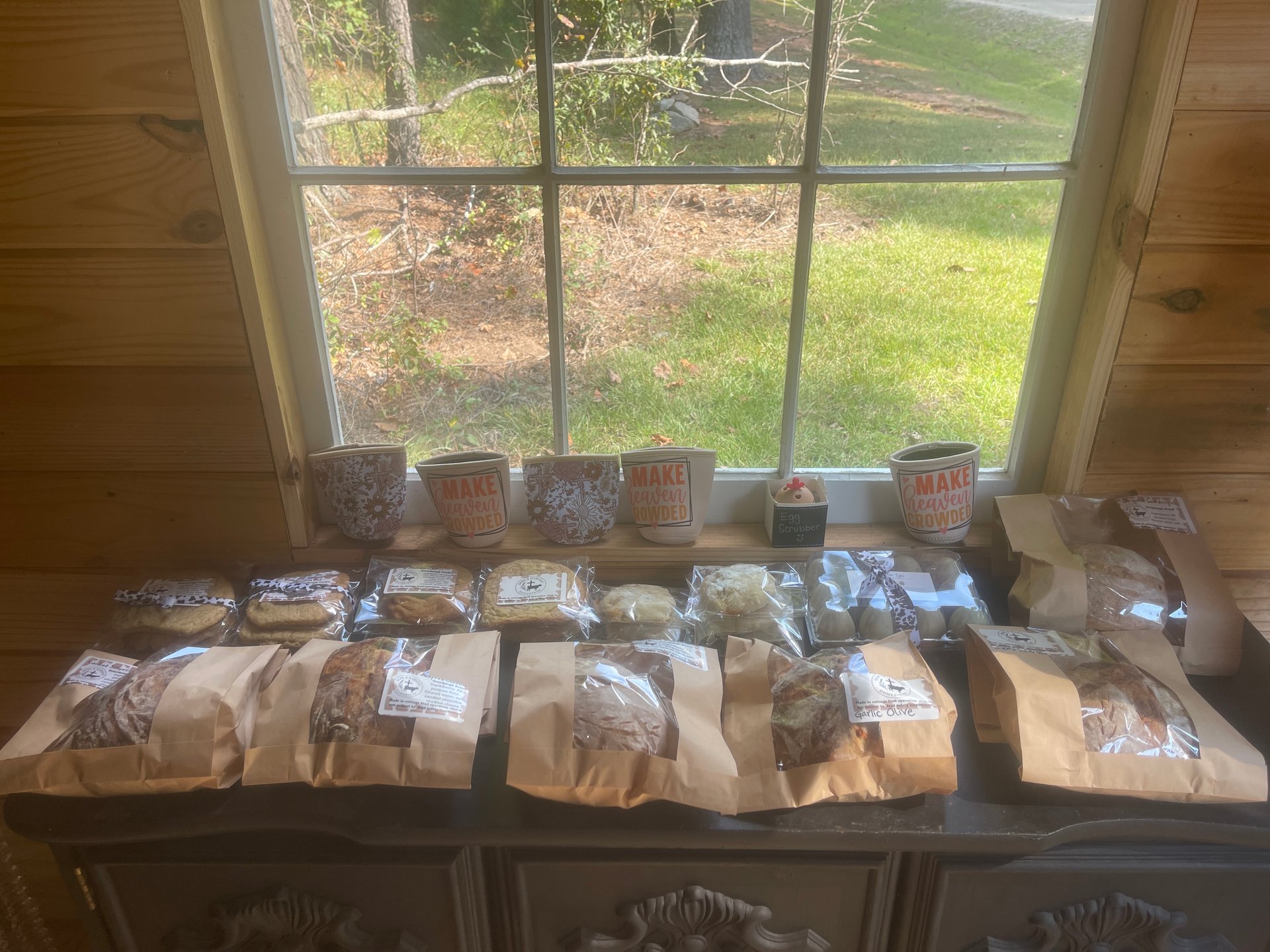 Garlic olive Sourdough, jalapeño sourdough, caper and sun dried tomato sourdough, cinnamon rolls, cookies,
